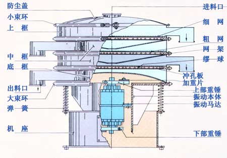 简述:振动筛是利用振子激振所产生的复旋型振动而工作的。振子的上旋转重锤使筛面产生平面回旋振动,而下旋转重锤则使筛面产生锥面回转振动,其联合作用的效果则使筛面产生复旋型振动。其振动轨迹是一复杂的空间曲线。该曲线在水平面投影为一圆形,而在垂直面上的投影为一椭圆形。调节上、下旋转重锤的激振力,可以改变振幅。而调节上、下重锤的空间相位角,则可以改变筛面运动轨迹的曲线形状并改变筛面上物料的运动轨迹。